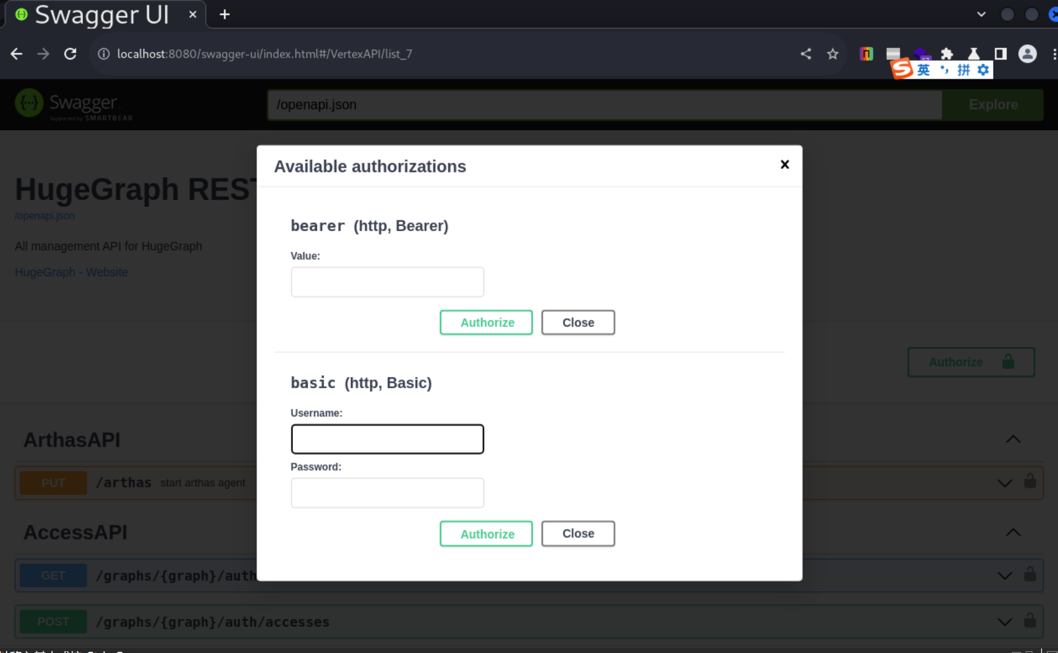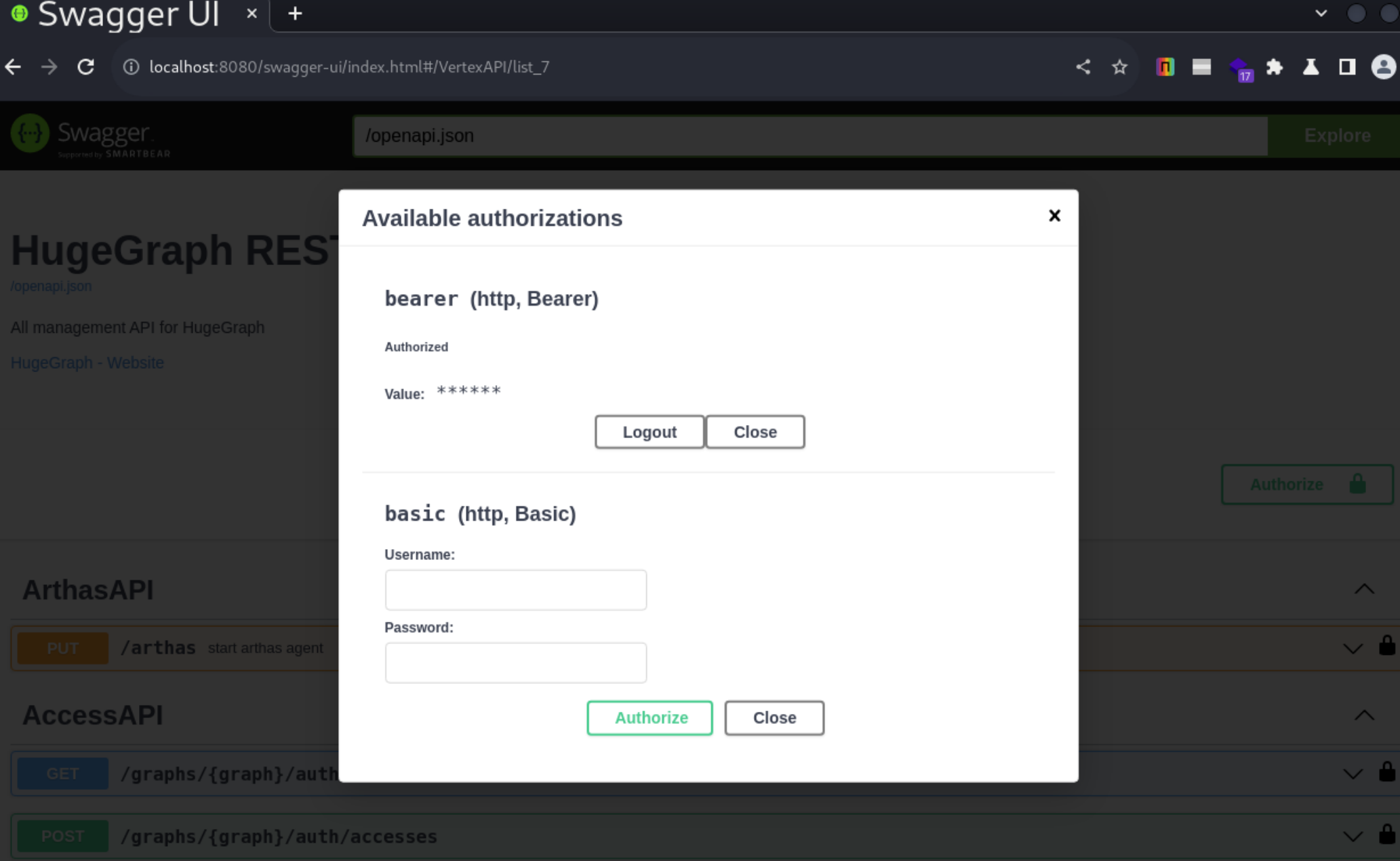 docker compose up -d启动服务后,你可以通过http://your-ip:8080访问 HugeGraph 的 API。为了安全,这个 API 默认是需要身份验证的,有两种方式: