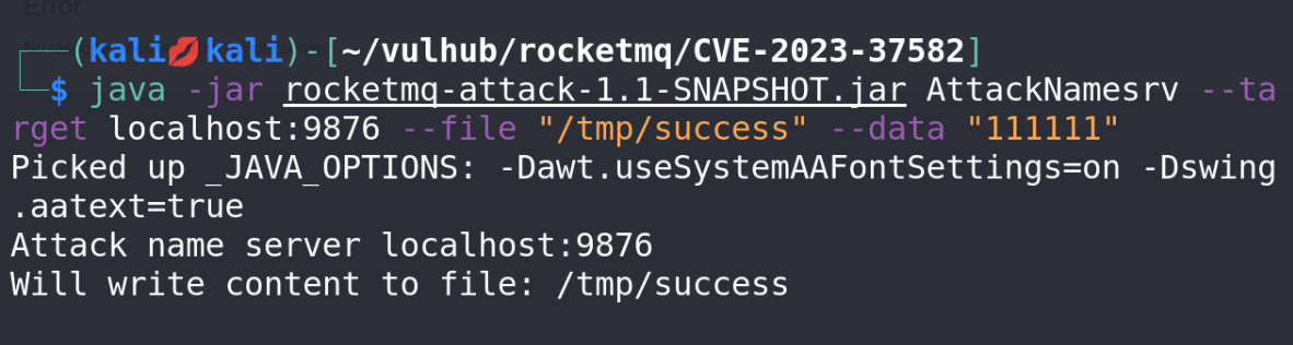 1 java -jar RocketMQ-attack-1.0-SNAPSHOT-jar-with-dependencies.jar localhost:9876 /tmp/testn.txt 111122233